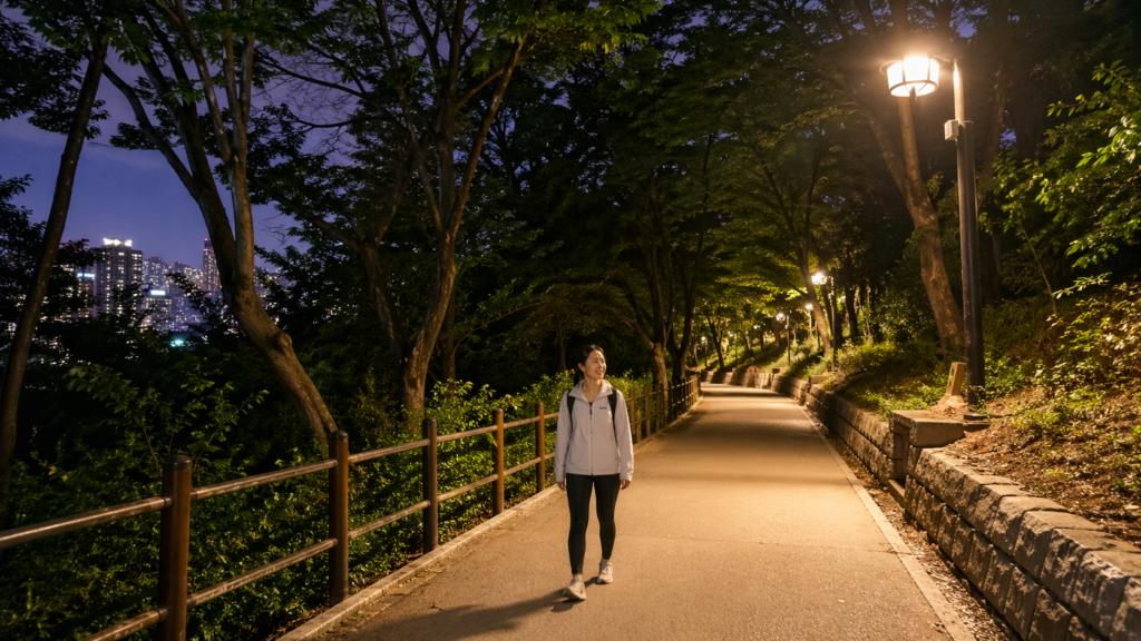 특히 “등산은 무섭지만 밤 숲길 분위기는 느끼고 싶다”는 분에게 잘 맞습니다. 자락길 위주로 움직이면 훨씬 안정적이고, 호흡도 크게 무너지지 않아요. 정상까지 욕심내기보다 자락길 산책 + 전망 포인트 정도로 즐기는 게 좋습니다.