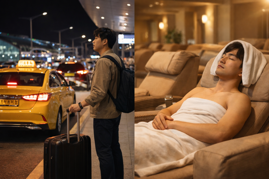 짐이 많고 몸이 이미 지쳐 있다면, 공항에서 몇 시간을 더 보내는 것 자체가 스트레스가 됩니다. 반대로 소형 짐 1개 정도고 샤워 후 잠깐 쉬는 게 가능한 상태라면 사우나가 꽤 괜찮은 대안이에요.