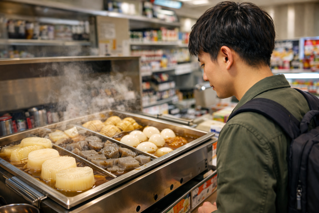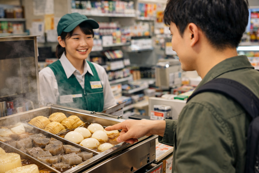 편의점 오뎅은 계산대 옆에 있는 경우가 많아서, 말이 잘 안 나와도 “고레 하나 오네가이시마스(이거 하나 부탁합니다)”만 해도 충분한 경우가 많아요.