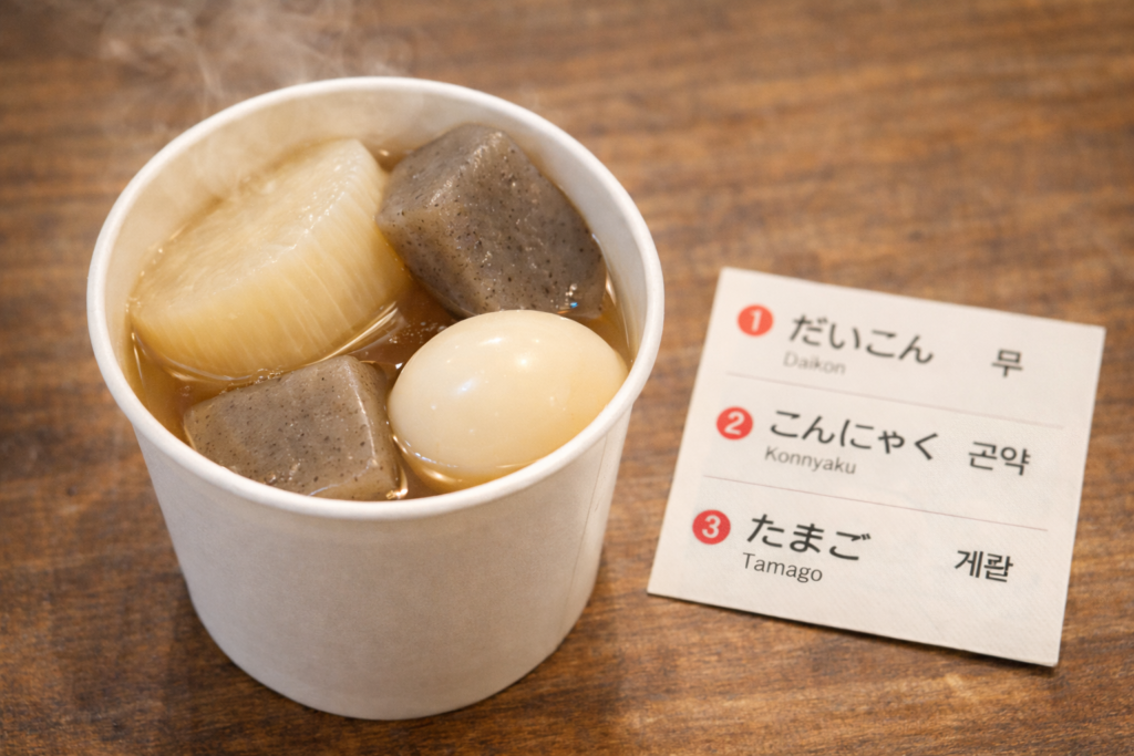 초보 여행자일수록 완벽한 일본어보다 짧고 정확한 표현이 훨씬 유리합니다. “다이콘 하나”, “타마고 하나”, “곤냐쿠 하나”만 해도 거의 다 통합니다.