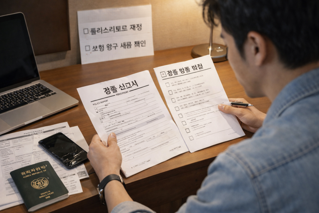 공항이면 항공사, 호텔이면 프런트, 렌터카면 업체, 투어 중이면 운영사에 먼저 알리세요. 나중에 보험사는 “현장에서 왜 즉시 신고하지 않았는지”를 물을 수 있습니다.