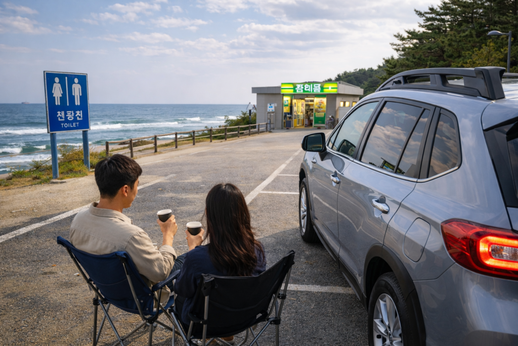 제가 초보 차박자분들께 가장 많이 권하는 타입이 바로 해변 공영주차장형이에요. 뷰, 편의점, 커피, 화장실이 한 번에 해결되는 경우가 많아서 첫 차박 성공률이 높습니다.